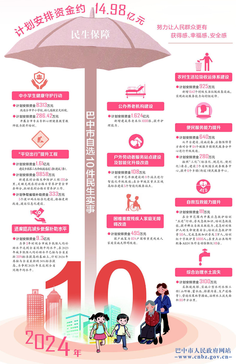 近日,市委办、市政府办印发《2024年市自选10件民生实事实施方案》的通知,经市委、市政府研究同意,我市在2024年实施好省定民生实事的同时,继续自加压力,实施市自选10件民生实事。计划安排资金约14.98亿元,主要围绕教育为民、公共交通、社会保障、养老服务、便民服务、城乡环境改善等重要民生领域,集中办好10件民生实事。