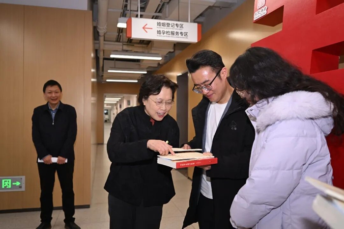 在平台企业家政培训中心,黄晓薇与家政从业者深入剖析行业发展难点痛点,鼓励企业精准对接养老育幼需求,不仅用力更要用心用情做好家政服务,擦亮巾帼家政品牌。在婚登婚检“一站式”服务大厅,黄晓薇为工作人员提供的高效便捷暖心服务点赞,向前来登记的新人送上祝福,勉励他们践行新型婚育文化,弘扬家庭文明新风,以“小家”之美为“大家”添彩,共创中国式现代化美好未来。